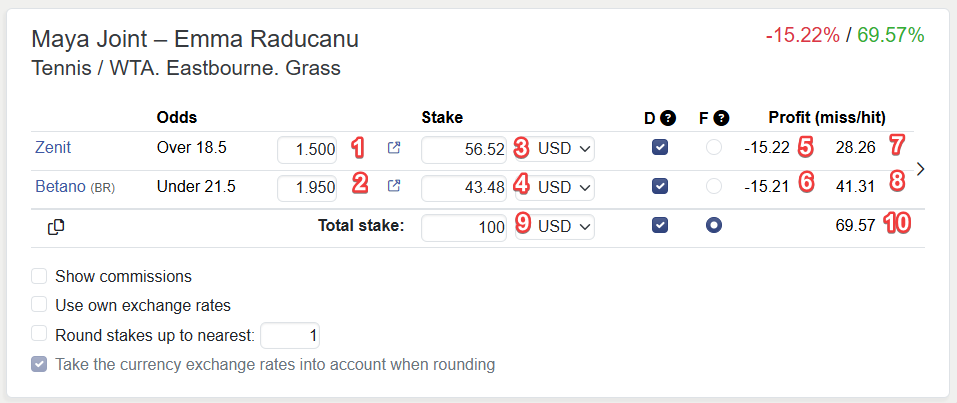 Калькулятор отображает все участвующие в вычислениях значения: коэффициент, комиссию (если она указана), сумму ставки, валюту, курс конвертации и распределение прибыли. Рассмотрим его подробнее.