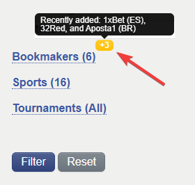 Недавно добавленные букмекеры отмечены значком «New» в панели фильтров. Он помогает быстро определить новое в списке.